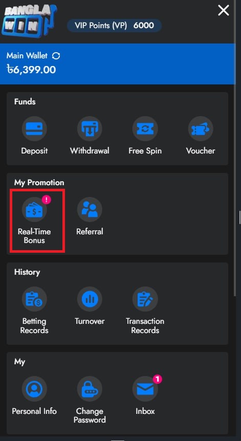 2. Go to My Account, then click the Main Wallet tab and select the Real-Time Bonus icon.