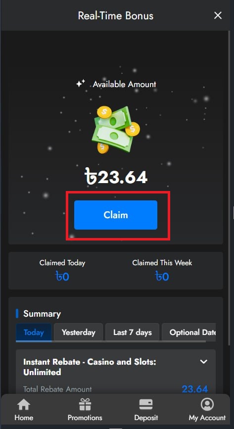3. Under Available Amount, click Claim to redeem your Rebate or Rescue bonus.